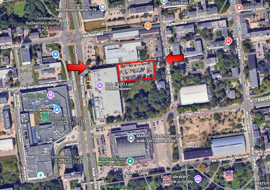 Poniżej znajduje się mapa z lokalizacją parkingu oraz dwoma wjazdami: od ul. Stefanowskiego i al. Politechniki.
